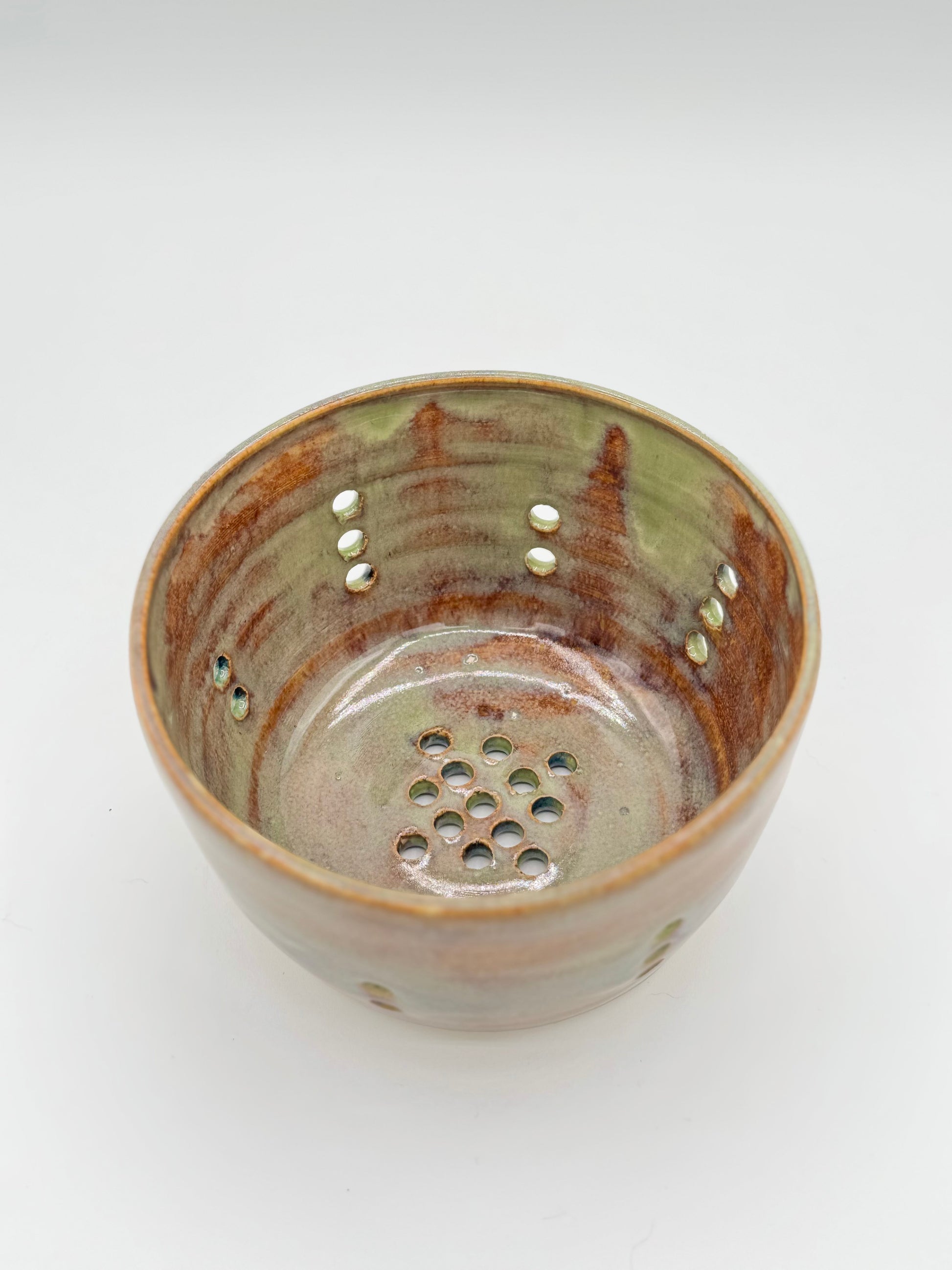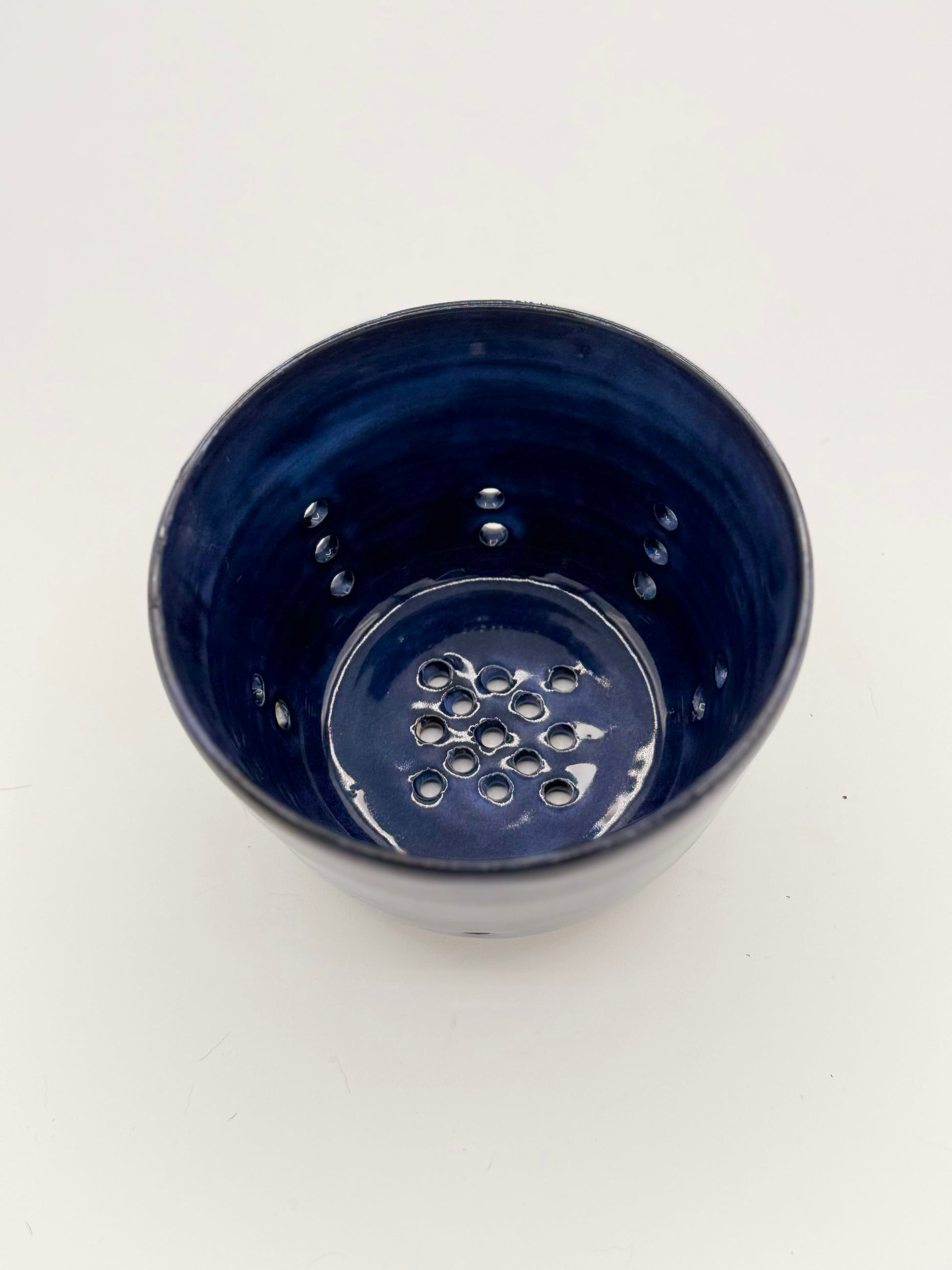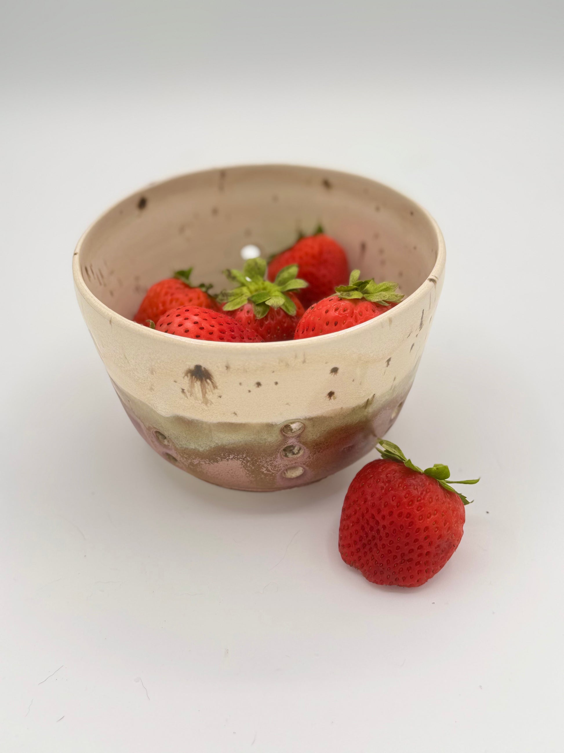 The handmade ceramic berry bowl is perfect for rinsing and serving fresh-picked berries, cherry tomatoes, or other fruits and veggies. The colander-style bowl drains perfectly, making it easy to go from sink to patio, dining table, fridge, etc.